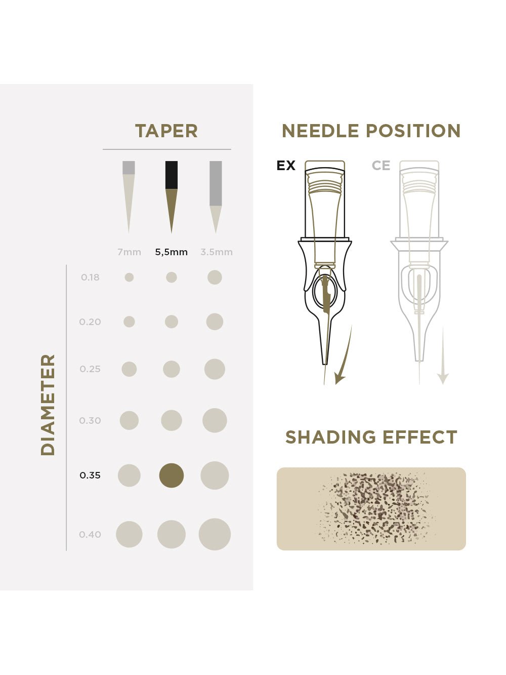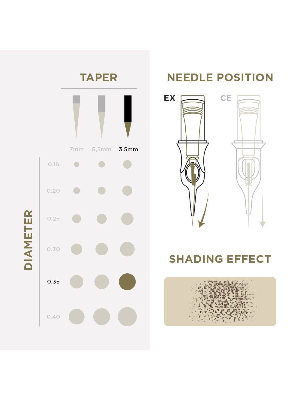 0.35 mm: Perfecto para tonos más anchos y definidos y para efectivos en el fiscal, este diámetro sobresale en las cejas sombreadas y en los colores de los labios carnosos. Detalles de Libra con cobertura, ideal para artistas que buscan versatilidad.