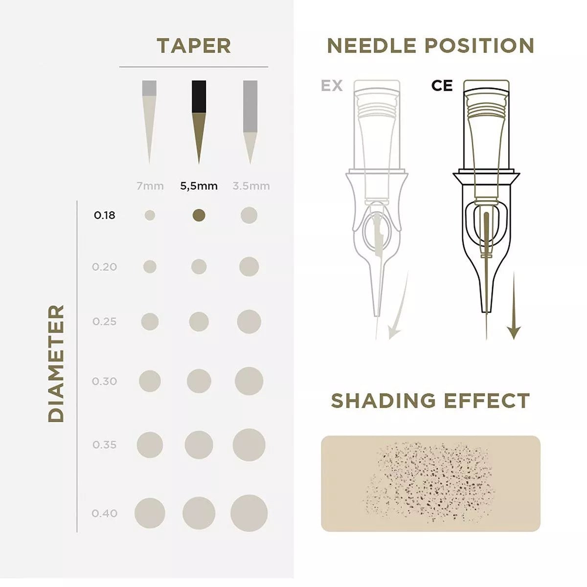0,18 mm: Diseñado para trabajos extremadamente detallados, adaptándose a patrones complejos y procedimientos difuminados de PMU.