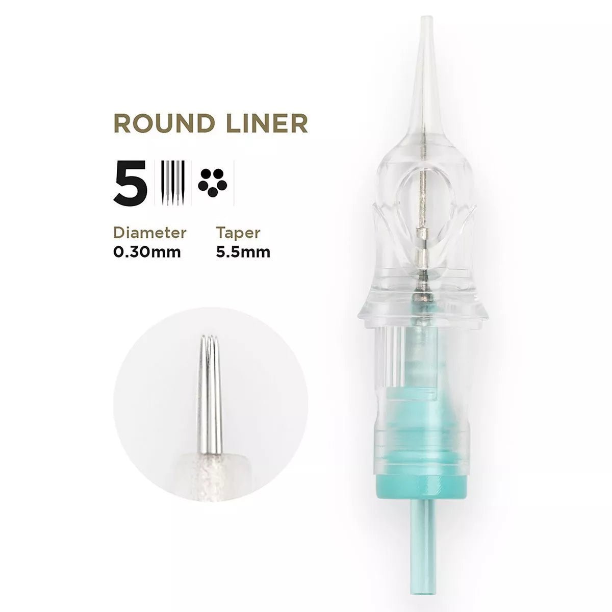 Punta 5R: Principalmente para líneas de tatuaje más audaces y sombreados. Para el Maquillaje Permanente, es ideal para trazos audaces, excelente para sombrear cejas más densas o procedimientos labiales dramáticos.