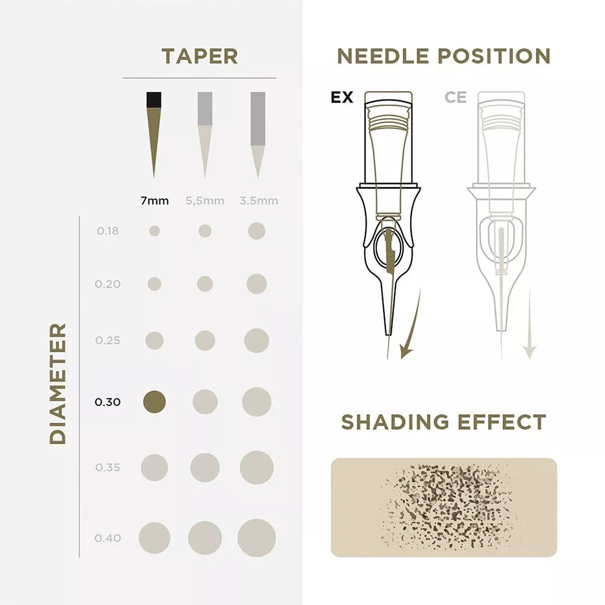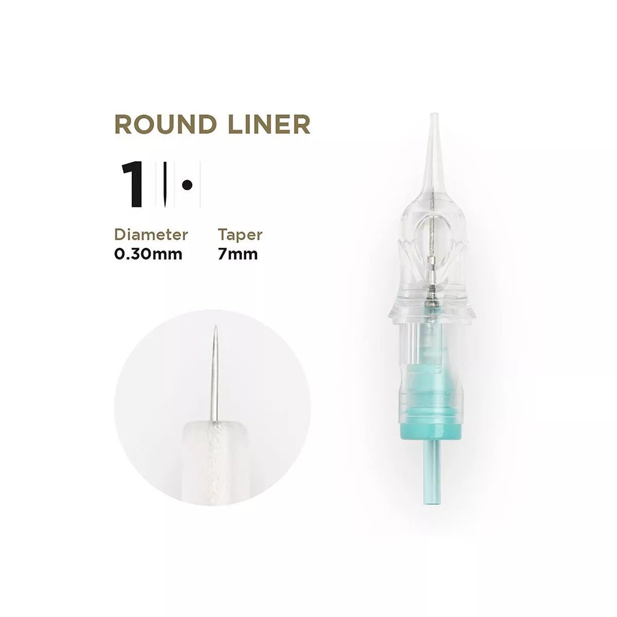 Punta 1R: Adatta per i dettagli più fini nei tatuaggi e nel trucco permanente. Fornisce la precisione ottimale per disegni complessi, tratti sottili e eyeliner dettagliati nei trattamenti PMU.